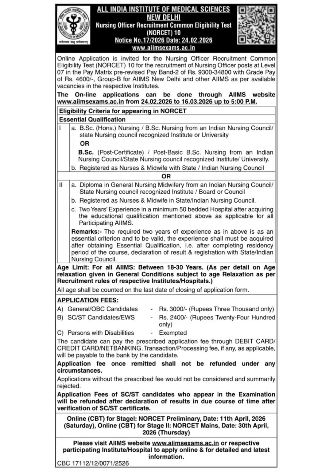 All India Institute of Medical Sciences (AIIMS), New Delhi has issued a short notification for the recruitment of Nursing Officer posts through NORCET 10th Phase 2026 (Advt. No. 17/2026) on its official website. The recruitment is being conducted for more than 3000 vacancies across various AIIMS institutions in India. The online application process will begin from 24 February 2026 and candidates can apply till 16 March 2026. Applicants must be at least 18 years of age and not more than 30 years as on 16 March 2026. Interested and eligible candidates are advised to carefully read the complete notification including eligibility criteria, qualification, selection process, exam pattern, syllabus, application fee and important dates before applying online for the AIIMS NORCET 10 Nursing Officer Recruitment 2026.