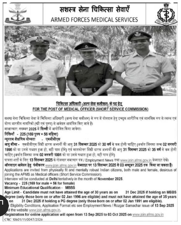 Armed Force Medical Service AFMS, has released a notification on official website for the recruitment of Medical Officer. This Recruitment Has 225 Positions Indian Army AFMS Application Form has started on 13 September 2025 & the candidates can apply till 03 October 2025. Candidates must check the complete details for Army AFMS MO Recruitment 2025. which has given below.