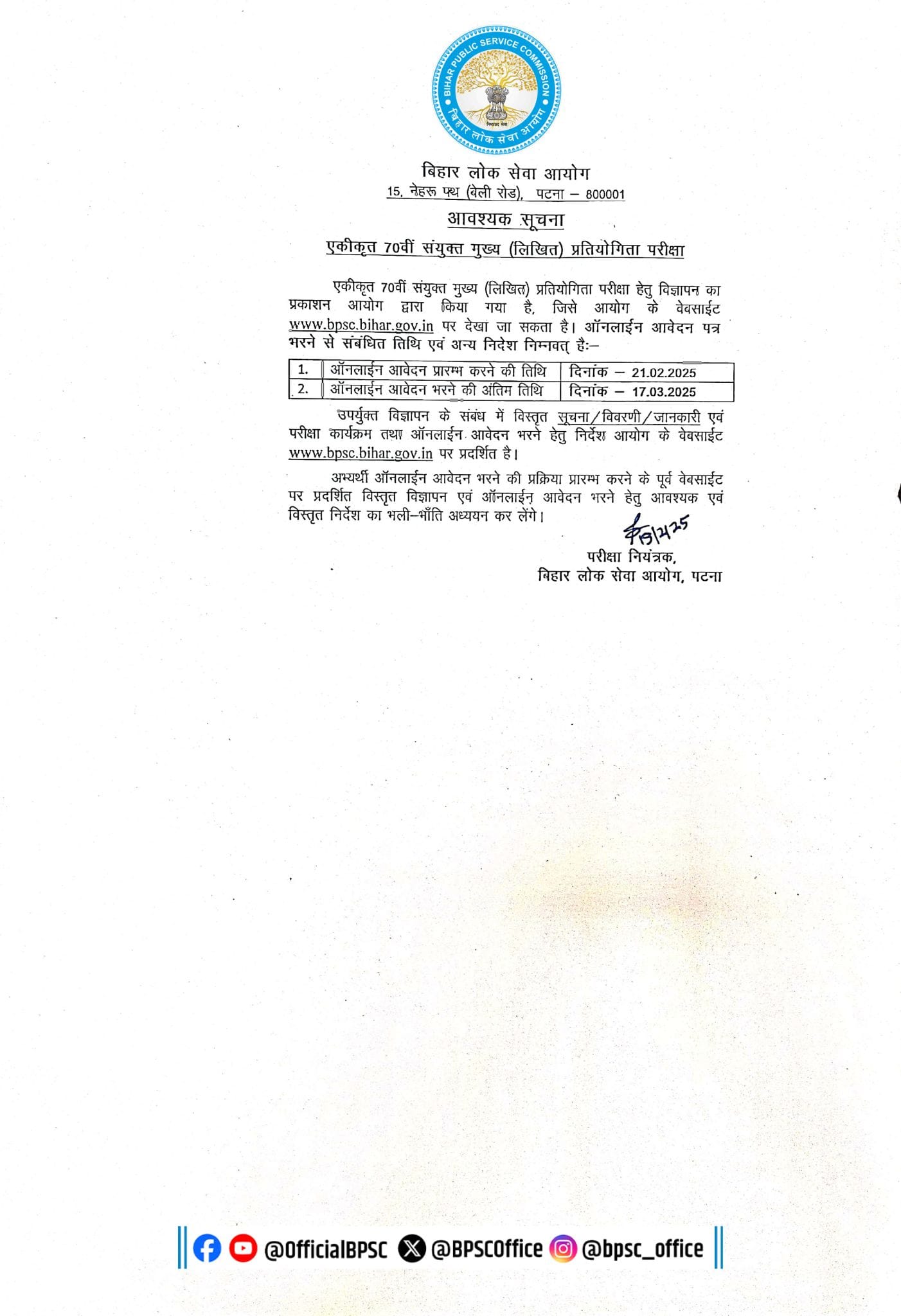 Bihar Public Service Commission (BPSC), has released the Mains Exam Date for the recruitment of 2035 Post 70th Combined Competitive Examination and other examinations 2025. The Mains Exam will be conducted on 25, 26, 28, 29 & 30 April 2025. Mains Online form started from 21 February 2025 to 17 March 2025. and can be checked through Enrollment number / Registration number / Date of birth by login into the portal. Which has given below.