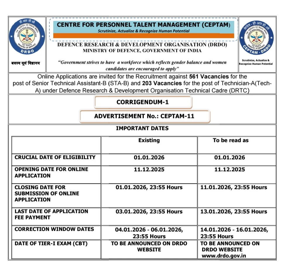 Defence Research and Development Organization (DRDO), The notification for the recruitment of Senior Technical Assistant-B, Technician-A has released on the official website. This recruitment is for 764 positions. The DRDO application form has started 11 December 2025, and candidates can apply until 11 January 2026 (Extended). The minimum age is 18 Years and the maximum age is 28 Years as on 01 January 2026. Candidates Can Also Check All Details on Official SarkariExam2026 for the DRDO CEPTAM-11 Recruitment 2026. provided below. (Advt No. CEPTAM-11)