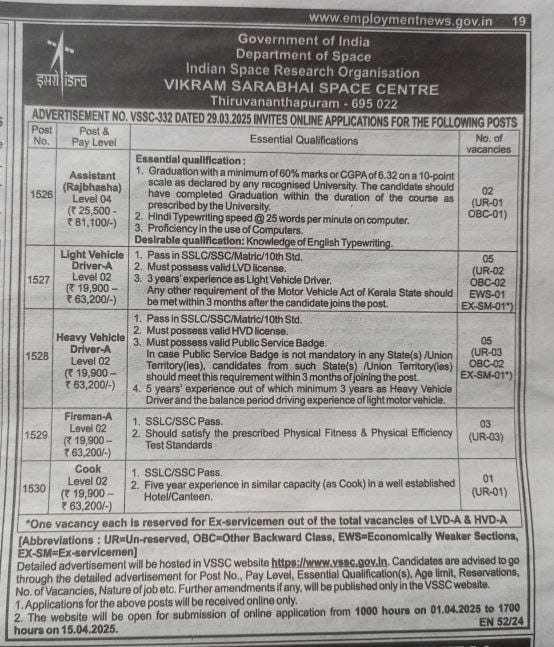 | ISRO VSSC Assistant, Driver, Fireman & Cook Online Form 2025 : Important Question |