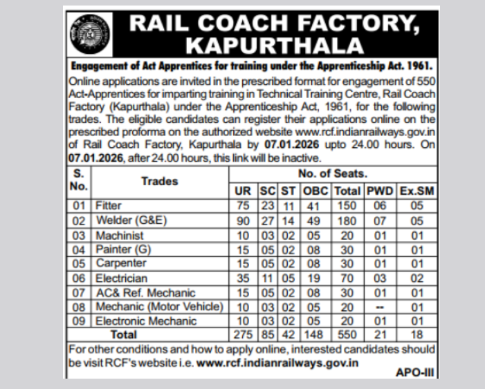 Rail Coach Factory Kapurthala, has released a notification on official website for the recruitment of RCF Rail Coach Factory Kapurthala Apprentice Post. This recruitment is for 550 positions. RCF Application Form has started on 09 December 2025 & the candidates can apply till the 07 January 2026. Candidates Can Also Check All Details on Official SarkariExam2026 for RCF Kapurthala Apprentice Recruitment 2026. which has given below. (Notice No.A-1/2025)