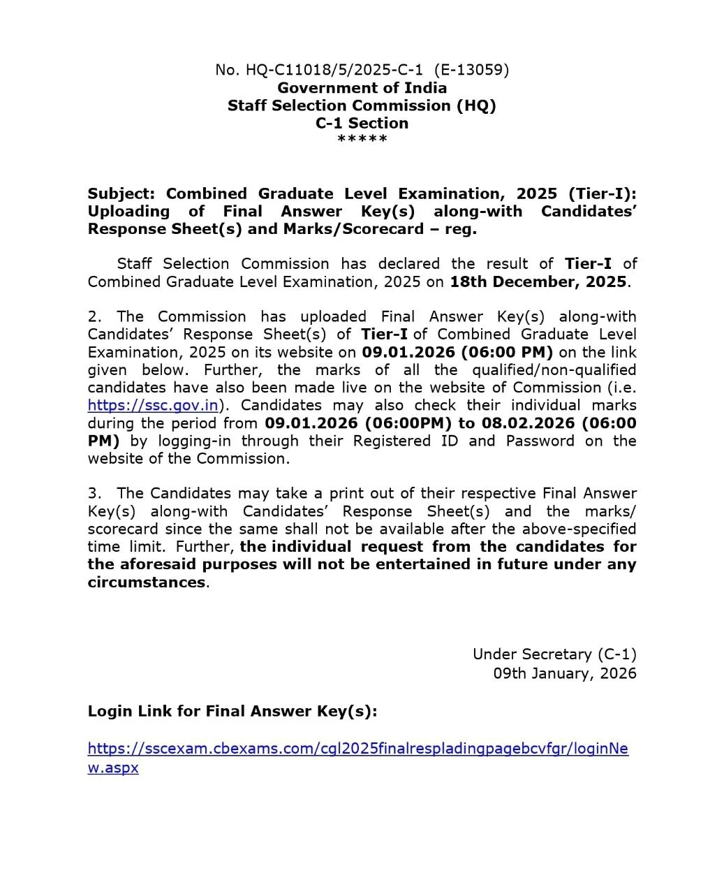 Staff Selection Commission (SSC), has released the Tier-II Answer Key now on its official website for the SSC Combined Graduate Level Tier-I Examination 2025. The Tier-II exam was conducted on 18-19 January 2026, and the last date to submit the application form was 05 July 2025. Candidates can check their Tier-II Answer Key using their Enrollment Number, Registration Number, or Date of Birth by logging into the portal. The direct link is provided below.